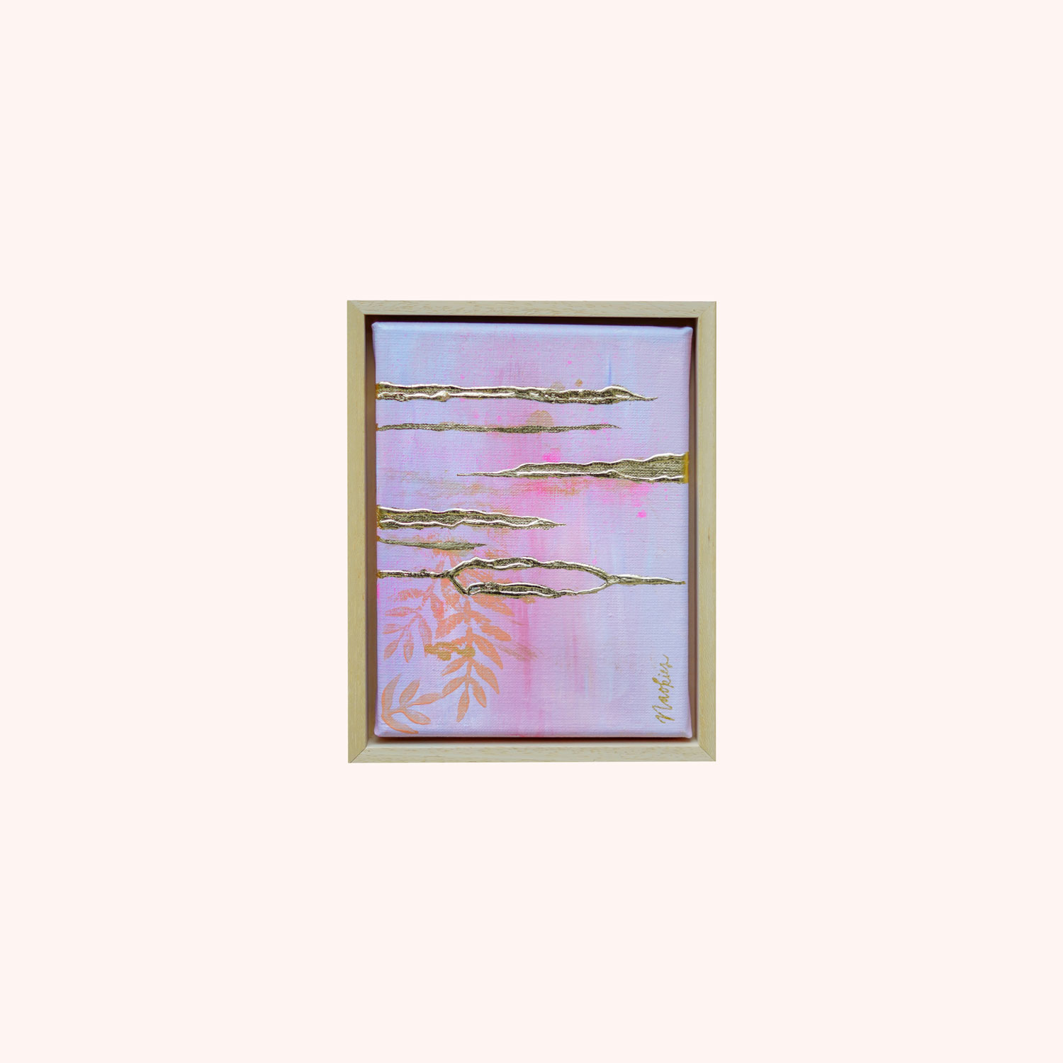 Resplandor (Shimmer) is een abstract schilderij van 18×24 cm, met een lila basis en goudfolie banen die een subtiel 3D-effect geven. Het werk doet denken aan zonlicht dat schittert op de zeespiegel en voegt een verfijnde, lichte sfeer toe aan elk interieur.